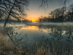 Alps, Almsee Lake, grass, autumn, viewes, Mountains, Austria, trees