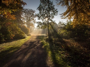 viewes, River, grass, Fog, coast, trees