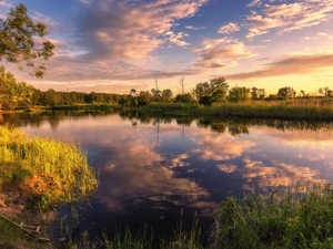 trees, lake, clouds, grass, Mountains, viewes, reflection