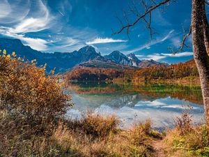Great Sunsets, autumn, grass, trees, dry, Fog, lake, viewes