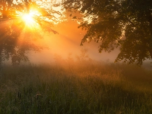 Valley, Houses, grass, rays of the Sun, viewes, Mountains, autumn, trees