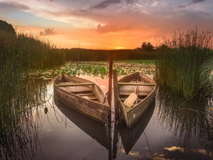 trees, viewes, Norway, Great Sunsets, Ringerike Municipality, Islet, lake, clouds